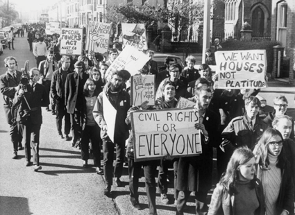 “At the bottom of the social pyramid with nothing to lose, the Catholic working man doesn’t really fear the Protestant; but the Protestant working man, who has very little, feels the need to hang on to his Protestant identity in case he loses what little he has. He fears the Catholic because he knows that any gain made by the Catholic minority will be his loss, for the businessmen and the landowners, Orange or Nationalist, are not going to suffer losses on anybody’s behalf. Where discrimination hurts most is in employment and housing.”