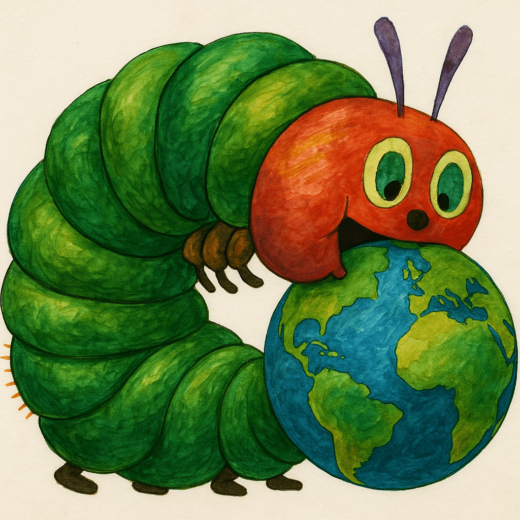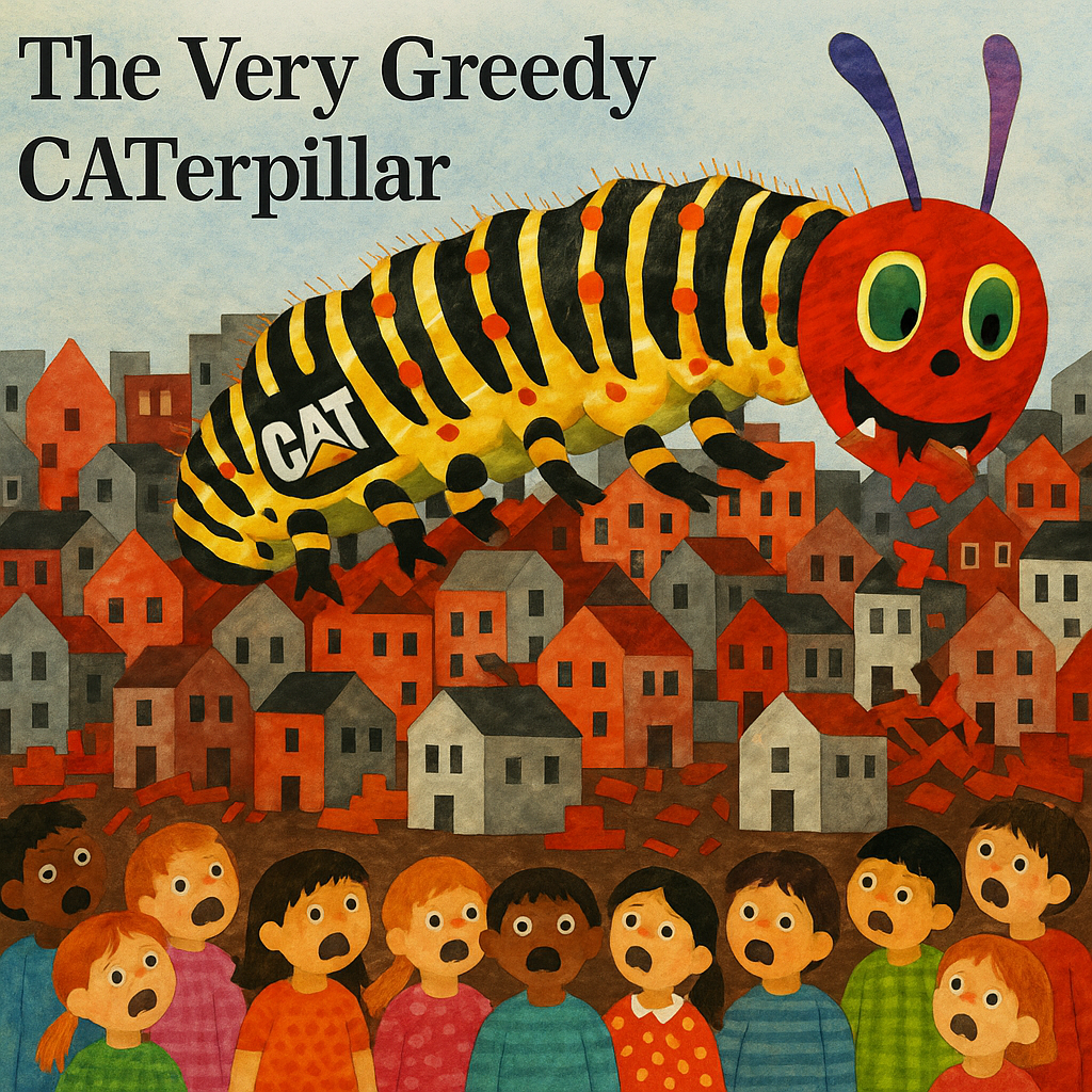“Now children, this Caterpillar isn’t just greedy. He’s the school bully. He already owns the canteen, but still steals your chips. That’s how big powers work too: they eat the world’s lunch, then call it ‘freedom.’Funny word, freedom, isn’t it?”